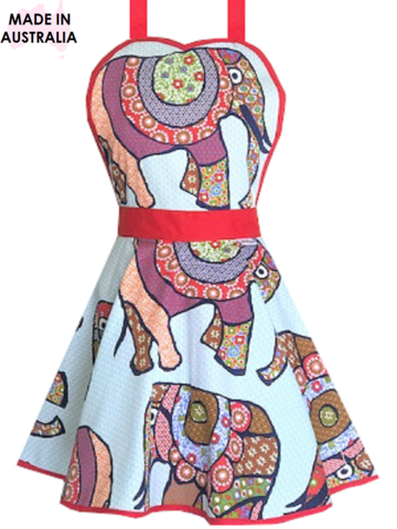 Our Elephant Apron has a red trimmed sweetheart neckline, extra long ties, a wide waist band and red trimmed hemline. Feel so glam and pretty while you whip up your baking or hostess a party! This is one truely unique kitchen apron that you will adore. 100% Cotton Drill. Proudly Made on the Gold Coast, Australia.